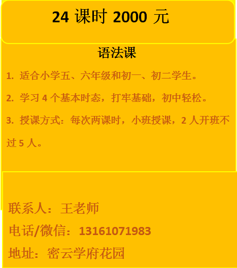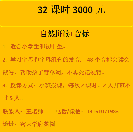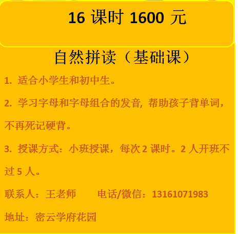 本人英语八级,有教师资格证,可以教授小学和初中英语。课程模式多样,一对一,一对二和小班,教材同步课程可约。同时还有自然拼读、音标班和语法班,小班授课,两人开班,最多不超过5人。现单人报两个班及以上立减200。多人报名优惠:2人一起报名,每人立减200,3-5人报名立减300,报名从速。报名电话13161071983或扫码添加微信
