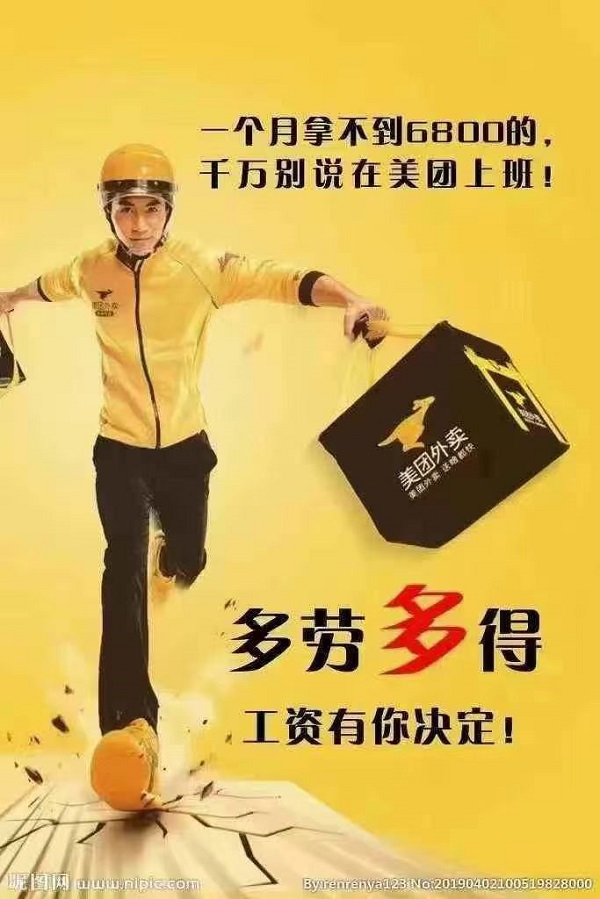 美团外卖招全职骑手 工作地点:密云区密云镇 入职要求:男女不限,工作相对自由 自己佩带电动车,也可提供租车 操作简单无需学历,智能手机会看导航即可 入职有师傅一对一教学 踏实肯干,月入过万 多劳多得,就看你有多努力 快来挣钱吧!咨询热线: 15210506042或扫码添加微信咨询